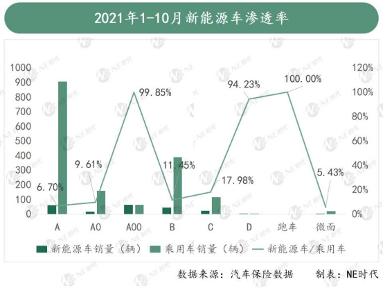 据汽车保险数据显示,目前整个乘用车市场以ABA0CA00级车为主。 以今年前十个月的销量来看,这些主流级别车型中,新能源车渗透率最高的还是A00级车型,其他级别车型的电动化替代空间基本都在90%以上。A级车作为乘用车市场体量最大的一部分,也是目前电动化转型压力最大的一个市场。