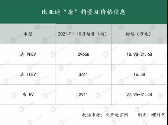 还有一款比较典型的就是宋Plus,插混版前十个月销量比燃油版还多出将近900台。前者价格区间在14.68-19.98万元,后者11.58-14.38万元之间,就汽车保险数据来看,插混版本主要起量的是14-16万之间的这两款,这跟燃油版的高配版差价非常小,所以在价格上还是非常有优势的。 不仅是A级车,在比亚迪体系里面,B级车唐PHEV低配版与燃油版车型价差也拉得很近,并且以高性价比完胜EV版销量。