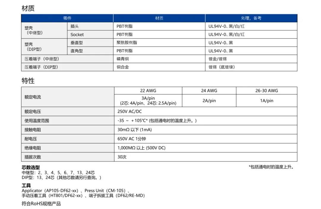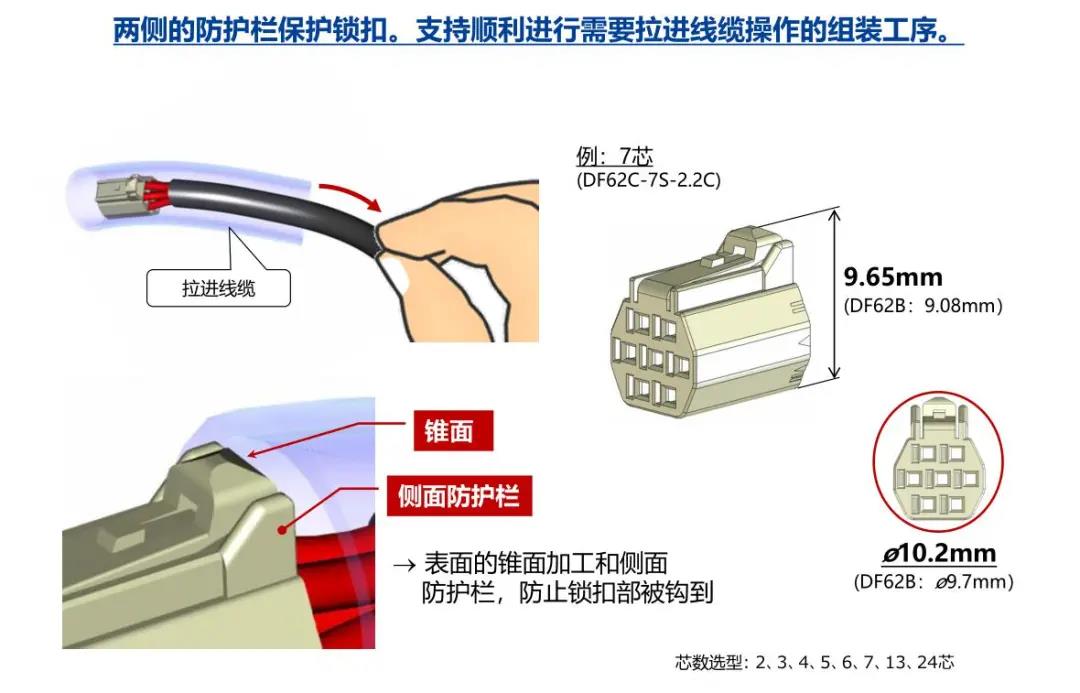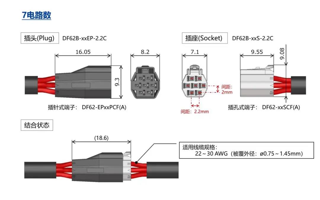 特点 [SignalBee™] 2 x 2.2 mm间距 用于狭小空间纤细型中继710寰宇连接器(UL C-UL认证产品) 1. 纤细光滑的外形适合狭窄空间的布线 2. 清晰的锁扣感和目视可确认是否锁定 3. 可靠的接触结构 4. 坚固的端子结构 5. 芯数选型:2、3、4、5、6、7、13、24 DF62B:标准型 DF62C:锁加部保护强化型 DF62P:面板安装型 6. 可与DF11/DF59系列共用自动压着设备 7. 防冷凝措施(防水型DF62W) 细小