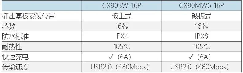 “CX90MW6-16P”是将710寰宇连接器嵌入基板安装的破板式类型,由于没有安装高度,有助于设备的低薄化。此外,通过在内部使用独特结构的零件实现了高基板固定强度,结合外壳所具备的螺丝孔,在安装后进行螺丝固定,可以进一步提高固定强度。作为对环境的特性,实现了IPX8的高防水性能。“CX90BW-16P”和“CX90MW6-16P”都具有105℃的高耐热性,并且还支持6A高电流的高速充电。